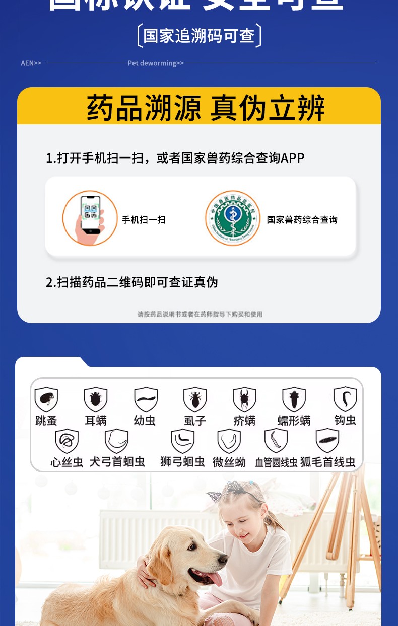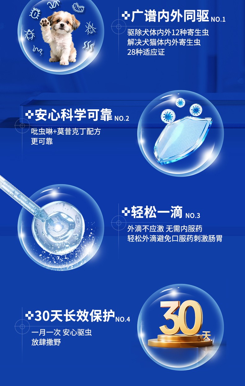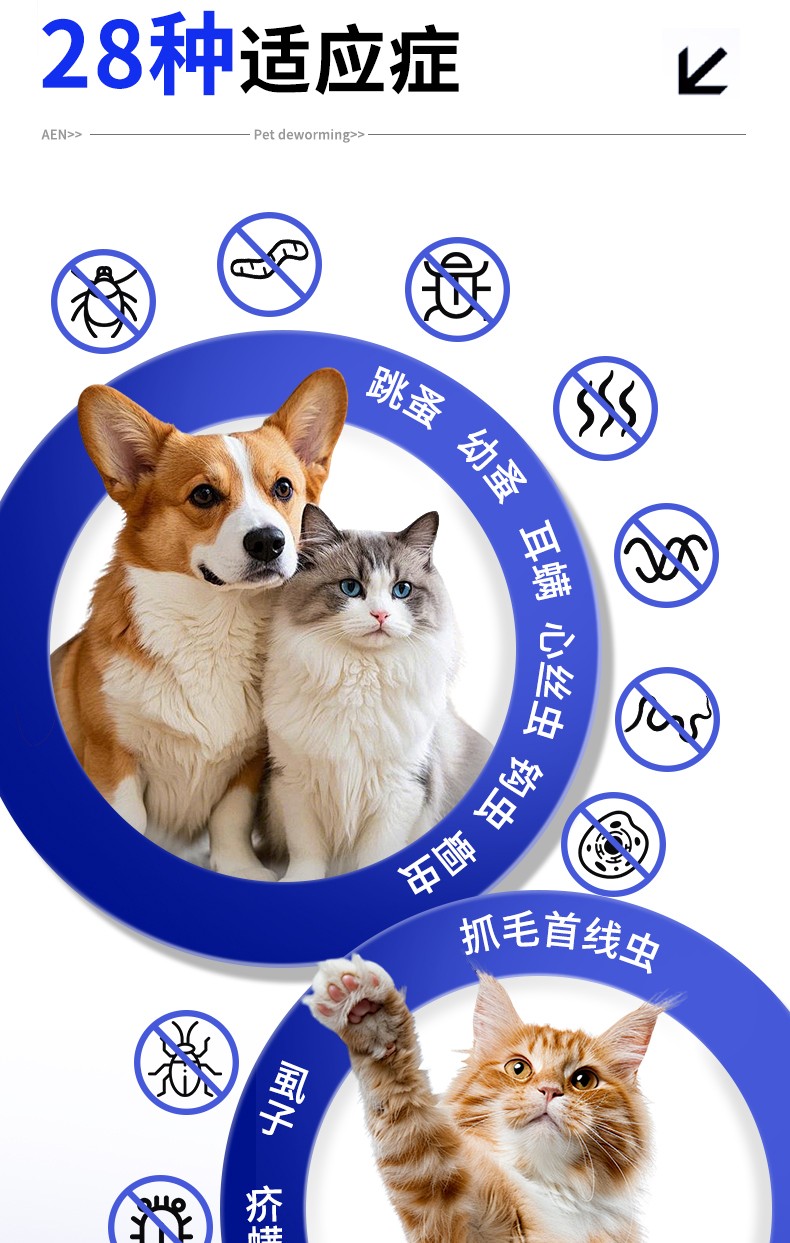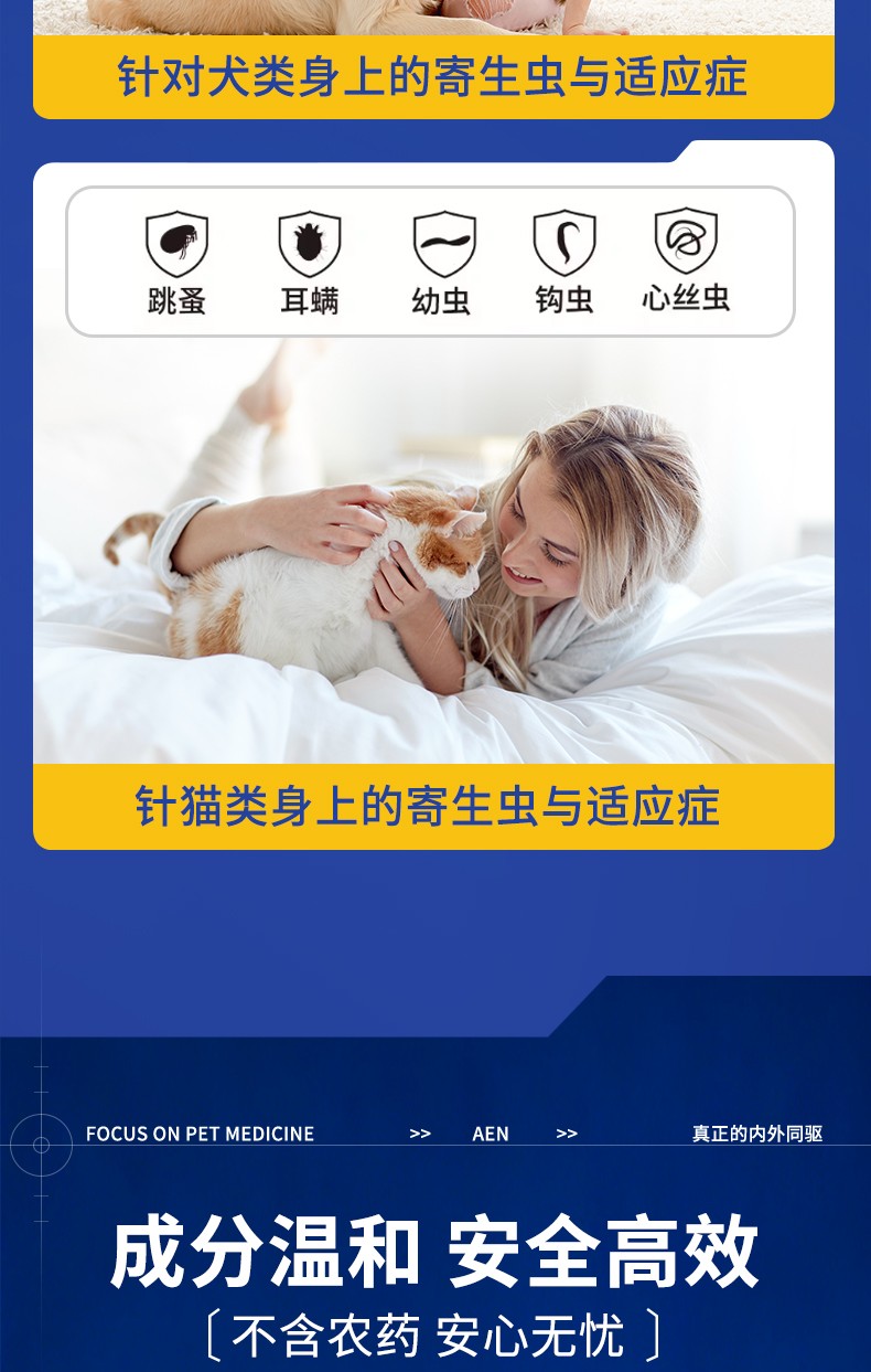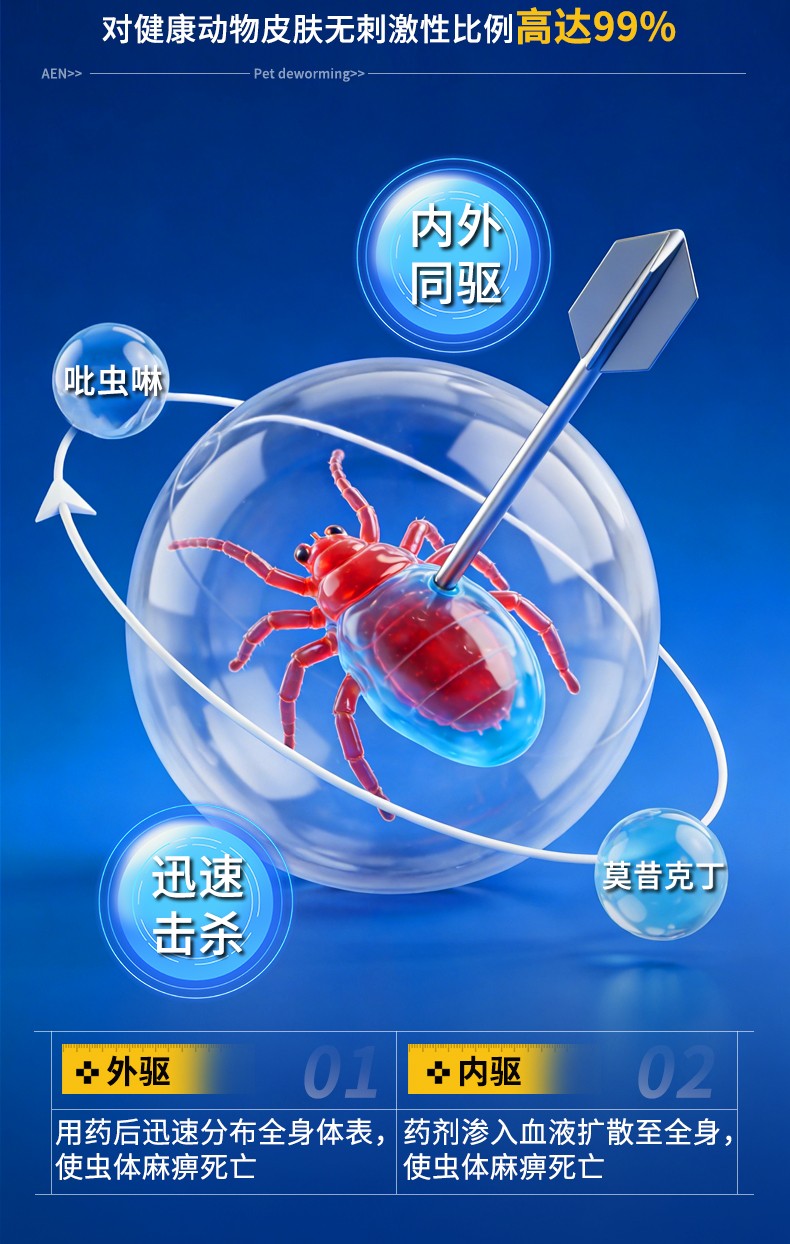 [适应症]用于预防和治疗犬的体内、外寄生虫感染。预防和治疗跳蚤感染(猫栉首蚤),治疗虱子感染(犬啮毛虱),治疗耳螨感染(耳痒螨)、犬疥螨病(疥螨)和蠕形螨病(犬蠕形螨),治疗血管圆线虫和胃肠道线虫感染(犬弓首蛔虫、犬钩口线虫和狭头钩虫的成虫、未成熟成虫和L4期幼虫,狮弓蛔虫和狐毛首线虫的成虫),预防心丝虫病(犬恶丝虫的L3和L4期幼虫),治疗循环微丝蚴(犬恶丝虫),并可辅助治疗因跳蚤引起的过敏性皮炎。