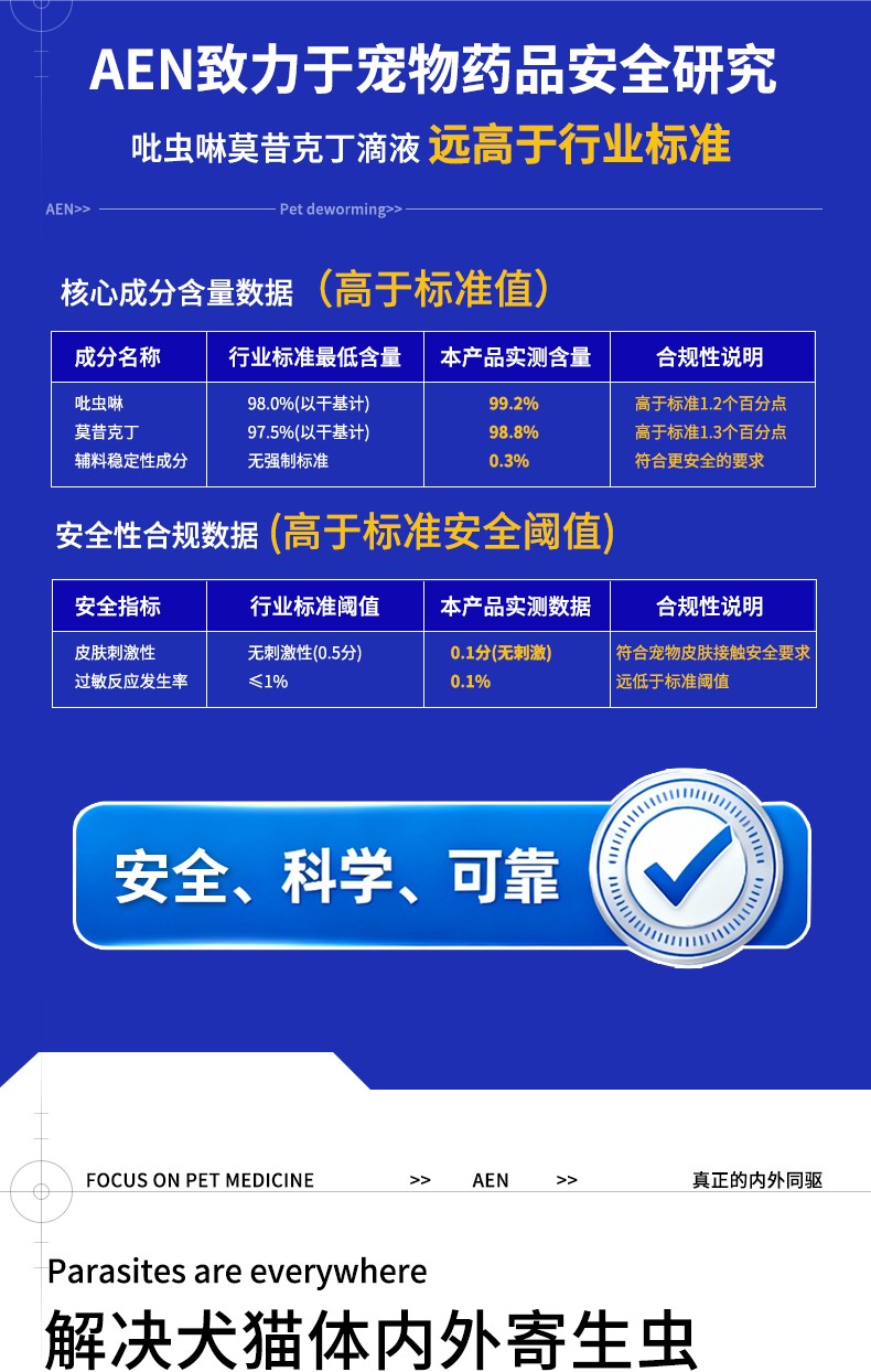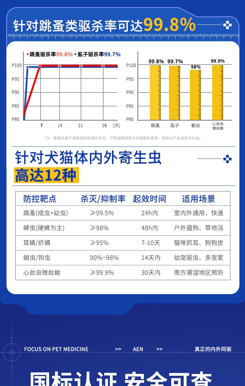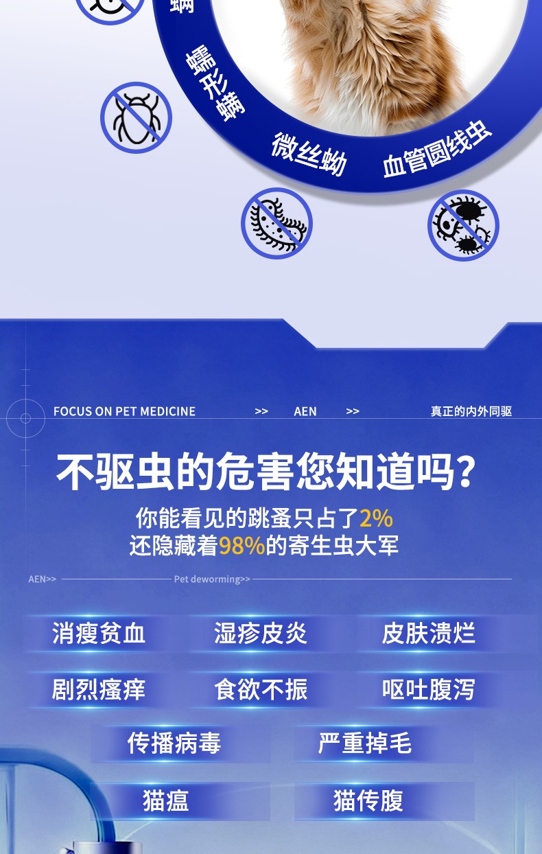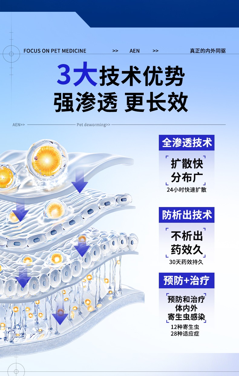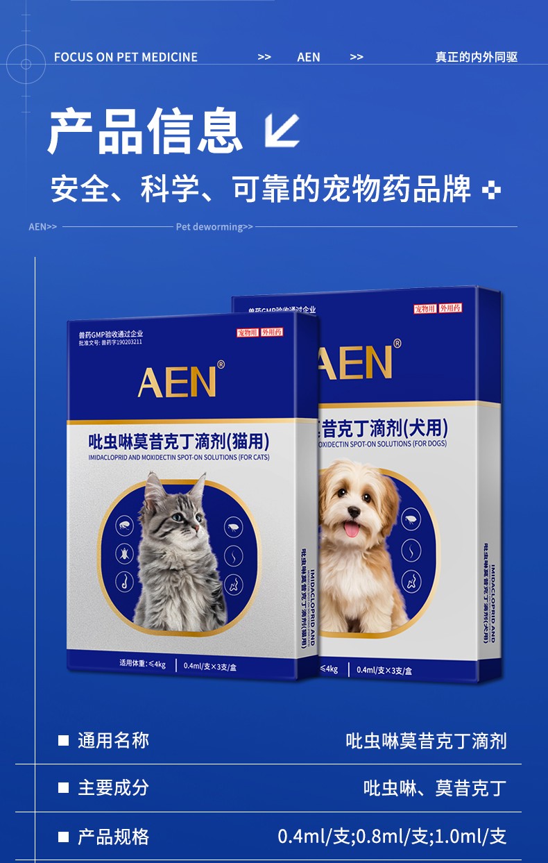 [适应症]用于预防和治疗犬的体内、外寄生虫感染。预防和治疗跳蚤感染(猫栉首蚤),治疗虱子感染(犬啮毛虱),治疗耳螨感染(耳痒螨)、犬疥螨病(疥螨)和蠕形螨病(犬蠕形螨),治疗血管圆线虫和胃肠道线虫感染(犬弓首蛔虫、犬钩口线虫和狭头钩虫的成虫、未成熟成虫和L4期幼虫,狮弓蛔虫和狐毛首线虫的成虫),预防心丝虫病(犬恶丝虫的L3和L4期幼虫),治疗循环微丝蚴(犬恶丝虫),并可辅助治疗因跳蚤引起的过敏性皮炎。