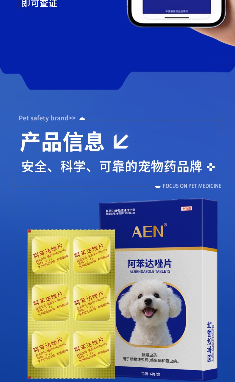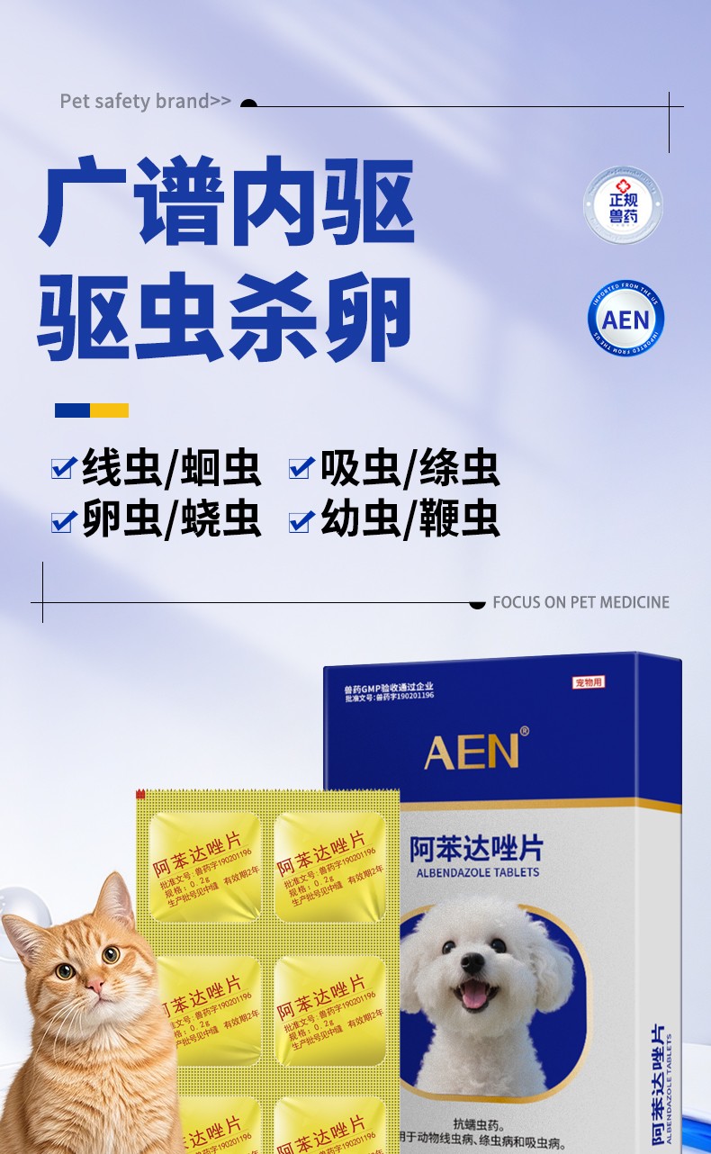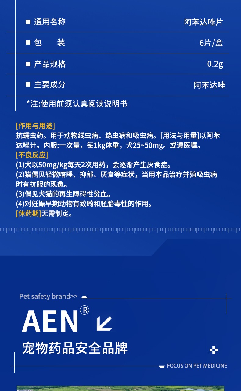 [用法与用量]以阿苯达唑计。内服:一次量,每1kg体重,犬25~50mg。或遵医嘱。